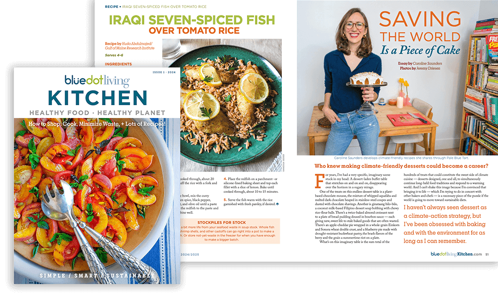 Bluedot Living Kitchen digital magazine and weekly newsletter includes planet-friendly recipes and tips to reduce food waste and shop sustainably.