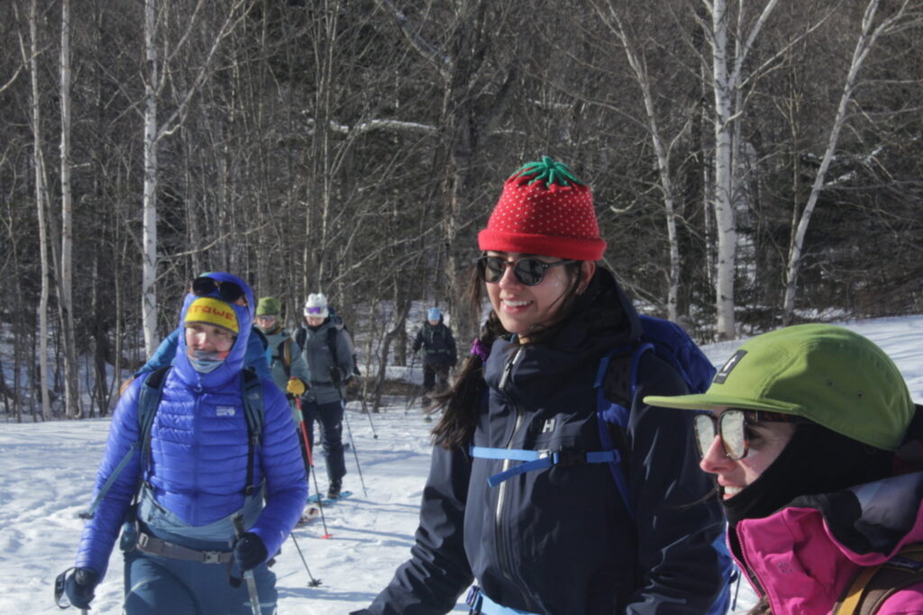 “My only friends that backcountry ski are a group of guys that have been doing it for a while. It kind of felt intimidating to go with them and be kind of left in the dust, or rely on them to teach me,” said Maddie Castle, who drove from Maine to Pinkham Notch Friday to attend the Chicks on Cliffs meetup.
