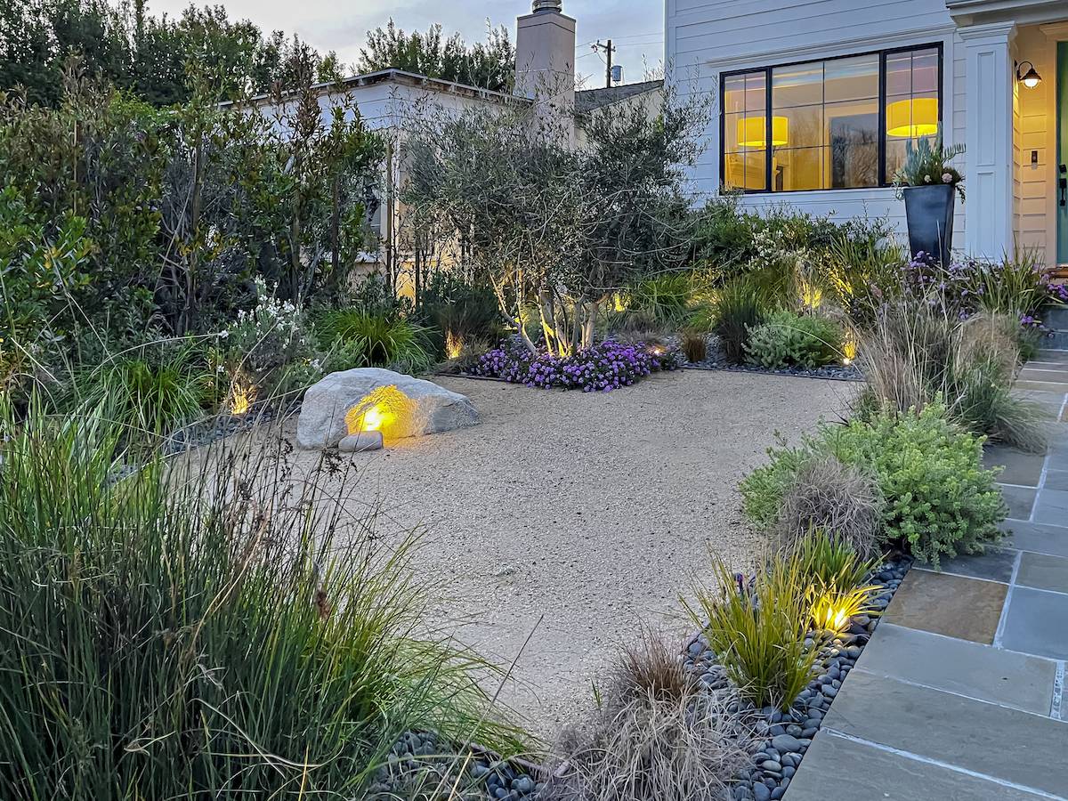 This front yard is a perfect example that drought tolerance isn’t exclusive to cacti and succulents. In fact, many grasses, shrubs, and flowers can be great water-wise choices, especially when native plants are incorporated. This garden packs a punch with a variety of plants that give it a wild, natural look, while dedicating a large portion to hardscaping as ground cover. Decomposed granite and rocks are used in a beautiful and styled way, highlighted by lighting at night. The surrounding space with large shrubs and trees, like an olive tree, brings height to the space, and grasses, rosemary, and purple lantana bring color and dimension. Lastly, the large planter on the porch gives style and life to an often-forgotten part of a front-yard landscape and can easily be changed throughout the seasons.