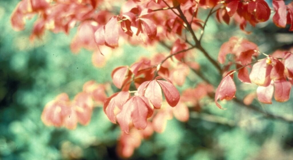 Burning bush (Euonymus alatus), also known as winged euonymus, is a deciduous shrub native to eastern Asia. It was introduced to the United States in the 1860s as a landscaping plant and has since escaped into the wild. In the fall, its small oval leaves turn a brilliant fiery shade of red, hence the name. The “corky wings” that grow as small ridges along the stems are helpful for identification.