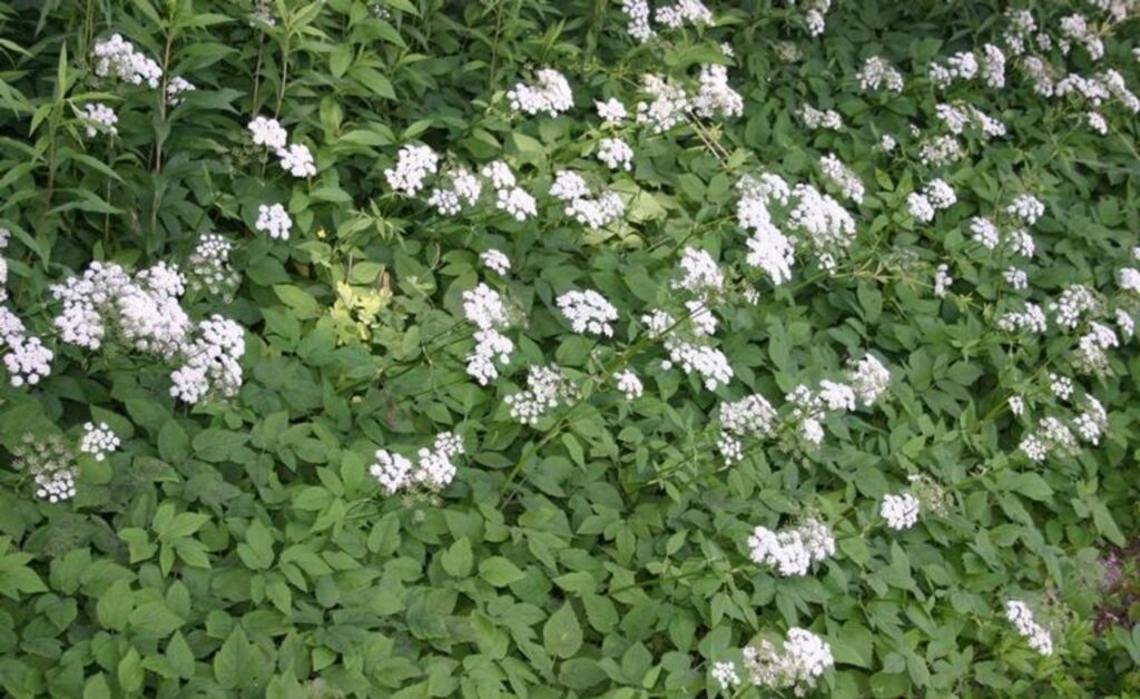 Goutweed (Aegopodium podagraria) is native to Europe and northern Asia and was introduced to North America in the 1800s as an ornamental groundcover. The lowlying compound leaves provide a thick coverage, producing a white, lacy flower under the right conditions. Cultivated varieties have been used for medicinal purposes to treat gout and to create variegated foliage.