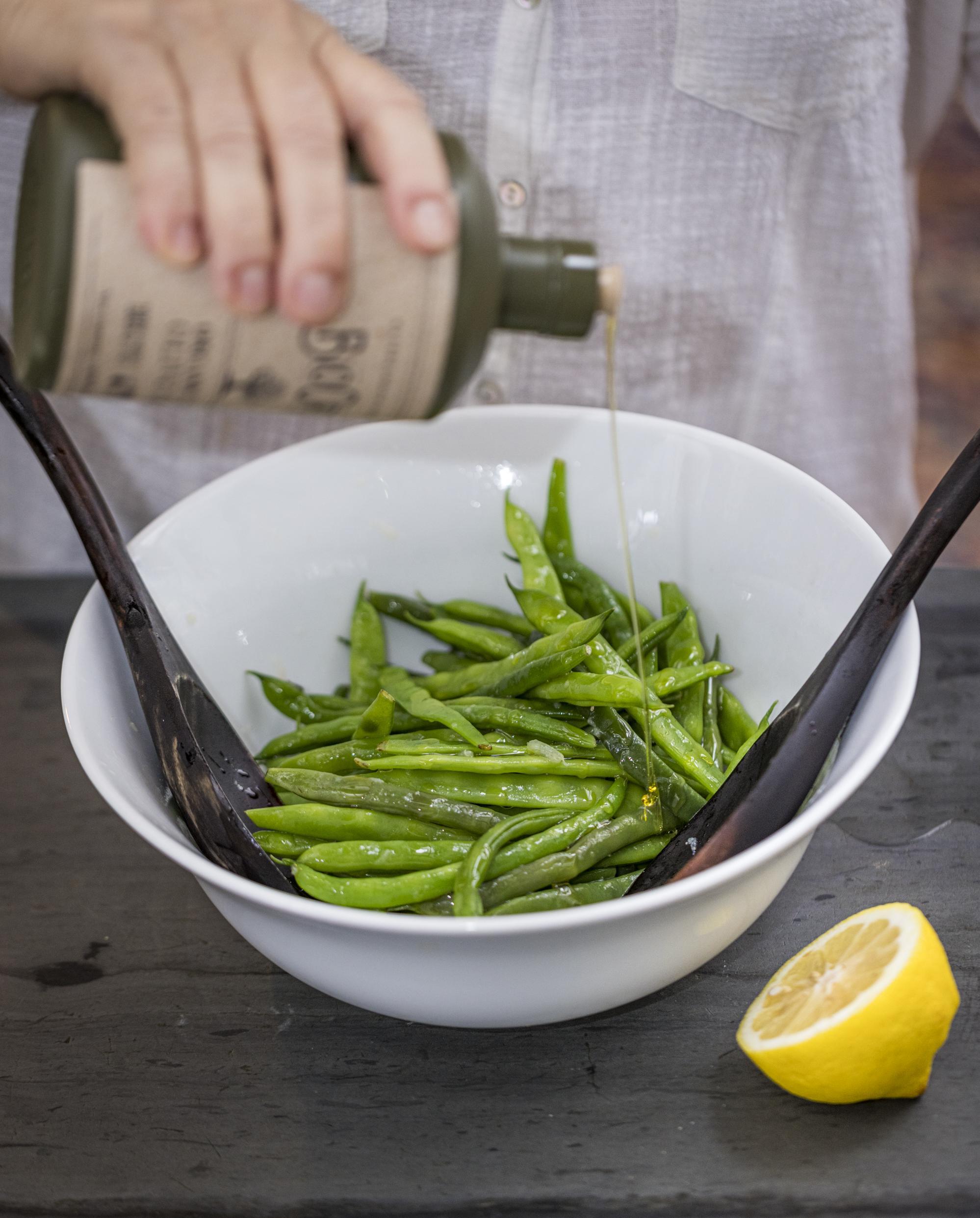 - Squeeze the half a lemon into a bowl large enough to toss the beans in. Add the salt and stir vigorously until it has mostly dissolved into the juice. Add the beans to the bowl and toss well to coat them evenly with the salty lemon juice. Drizzle a little olive oil onto the beans (one or two teaspoons at most), and toss again to spread the oil around.