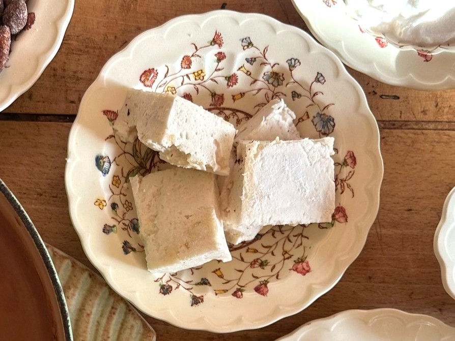 - While whisking, slowly pour the syrup mixture over the gelatin. Whisk until the mixture becomes pale, fluffy, and tripled in volume. Working quickly, transfer to the lined baking dish, dust the top with powder, and leave to set in the fridge for at least 1 hour or until firm.