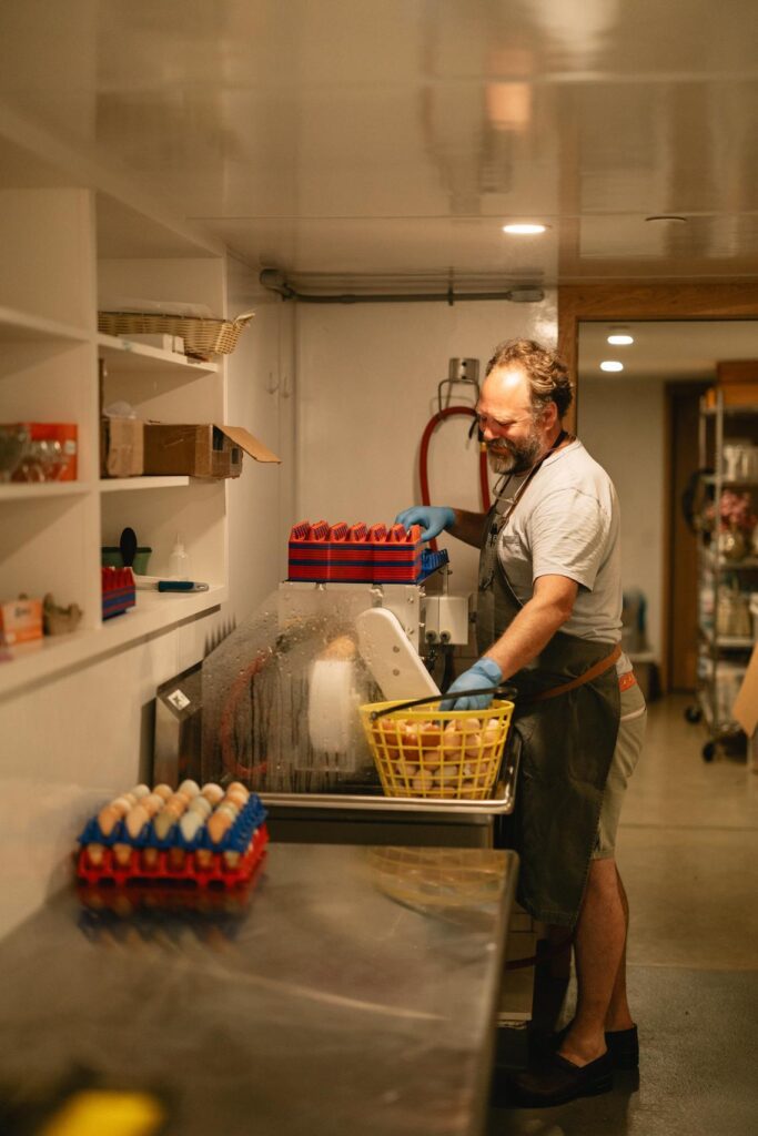 That means rotating animals daily, both to improve soil health and to provide the “flerd” with “a new salad bar every day,” Julie says. It means cultivating dye gardens and native plants, and washing hundreds of eggs a week in a humming prep room downstairs (which “takes a lot of focus,” culinary director Charlie Granquist jokes). It’s a place where a five-year-old might be felting wool while a visiting chef prepares an elegant tasting menu.