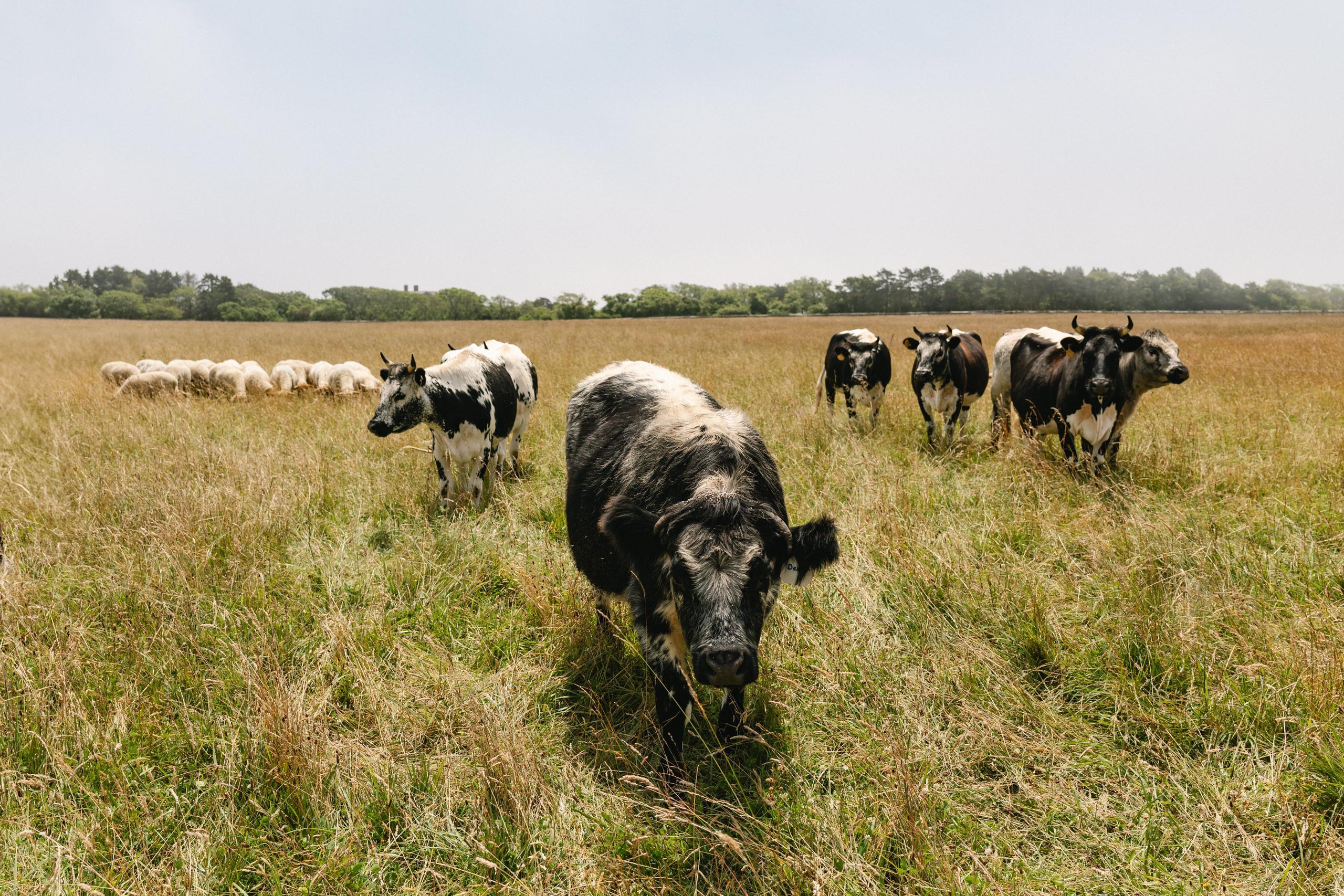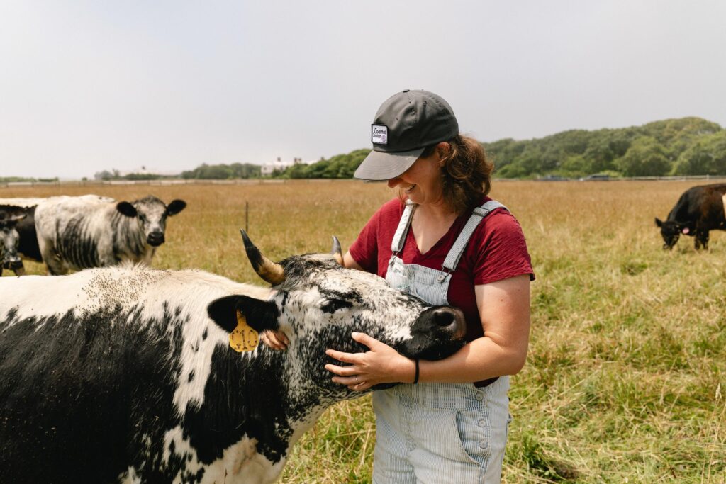 Slough Farm spans several growing and pasture properties across Katama: the main campus and 25 acres at the town-owned Katama Farm, also known as the FARM Institute, which Slough manages in partnership with the Trustees of Reservations. Altogether, the farm stewards about 80 acres, most of it devoted to pasture-based livestock. Everything Slough produces — meat, eggs, and vegetables — is donated through partnership with food equity organizations including Island Grown Initiative (IGI), the Island Food Pantry, local senior centers, schools, and libraries.