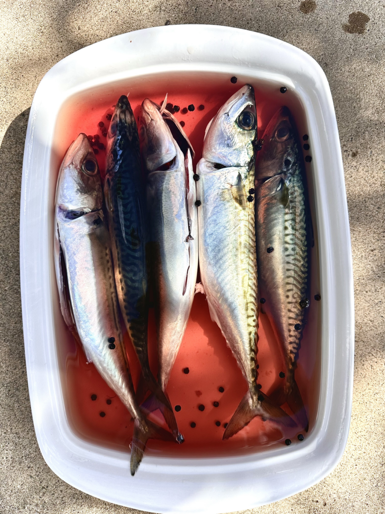 One hundred percent of his catch is harvested hook and line as opposed to using a net. Nets can catch unwanted species and drag them underwater for extended periods. They also beat up the mackerel, and by the time they are pulled up, they are dead and smashed. Because of its oily consistency, mackerel can’t take any pressure without getting slimy.
