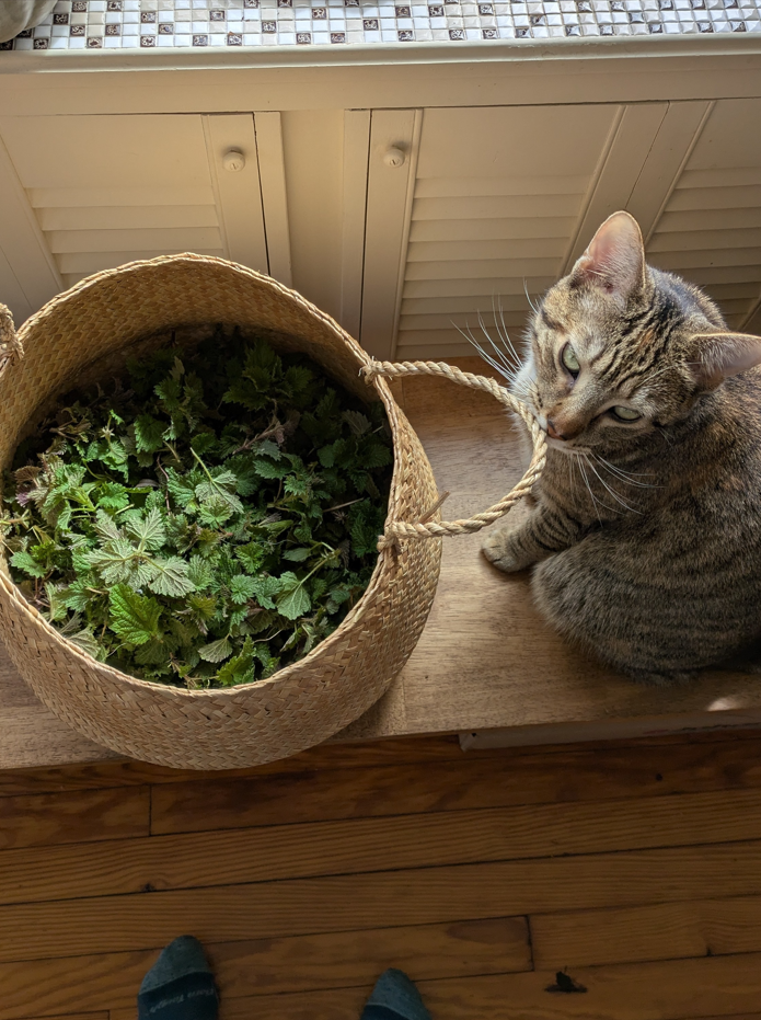 If I’ve convinced you to give nettles a try, I encourage you to put on gloves, long pants, and long sleeves, and go foraging. Springtime is a great time to look, because that’s when the new growth sprouts up. It’s important to harvest plants when they are young and haven’t yet flowered, when they contain more nutrients and are less bitter. Rachel Diak (the herbalist) told me that foraging younger leaves is ideal because the older plants contain compounds that can be hard on the kidneys. You can freeze or dry unused nettles to use throughout the year.