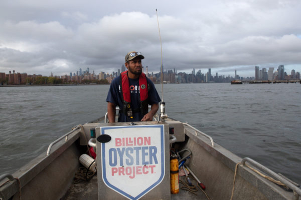 Johnny Anderson, BOP’s fabrication coordinator, pilots the boat carrying shells from Governors Island to the Williamsburg shoreline on an oyster reef installation day.