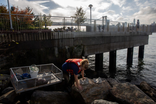 The BOP’s Emily Roan, a remote setting technician, and Zhu tag shells before placing them along the Williamsburg waterfront under part of a promenade at Domino Park — about a mile from Lighthouse.