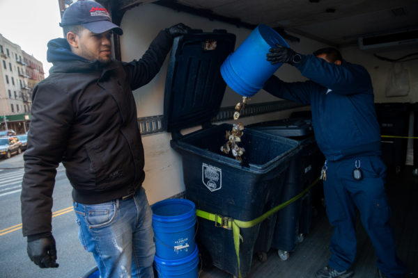 When customers finish their oysters, Lighthouse staff put the discarded shells into special blue bins. Joel Rosado, left, and Boris Delgado, workers with shell collection partner the Lobster Place, pick up and pour the discarded shells into the back of their truck.