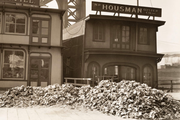 Oysters used to thrive in the New York harbor and were plentiful. Long ago, the Lenape people ate oysters and fashioned tools from the shells. For centuries after the city was founded, oysters remained an iconic local delicacy, peddled from carts on streets and from oyster houses, like the two pictured here under the Manhattan Bridge in 1937.