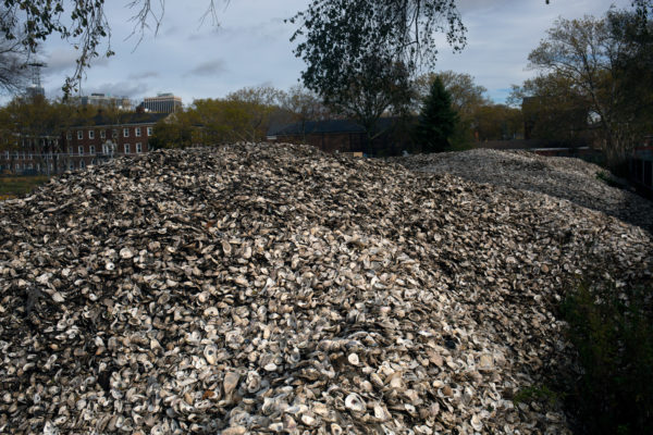 At the southeastern edge of Governors Island, a truck tips the shells into a pile with countless others. The mound weighs between 400,000 and 500,000 pounds, and towers over six-feet high at its tallest point. When the breeze blows, the newer shells give off the scent of the ocean.