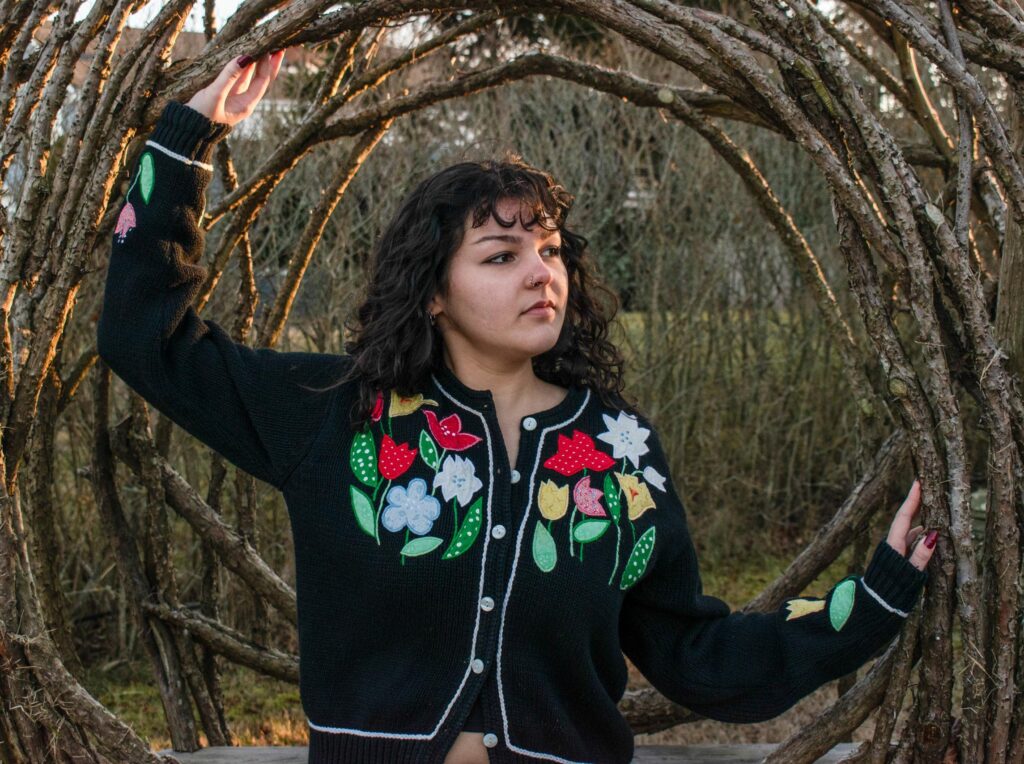 “Thrifting is cheaper,” my friend Marley Viselli said, “and on-island [thriftstores are] the only places with affordable clothes.” Marley frequents the thrift stores with me, and in the pictures, she’s posed wearing one of her wardrobe staples — a thrifted black silk skirt. For her photos, I picked out a black cardigan with patchwork flowers on the front, which made me hope spring was coming soon, even though the freezing weather that day didn’t make it feel that way at all.