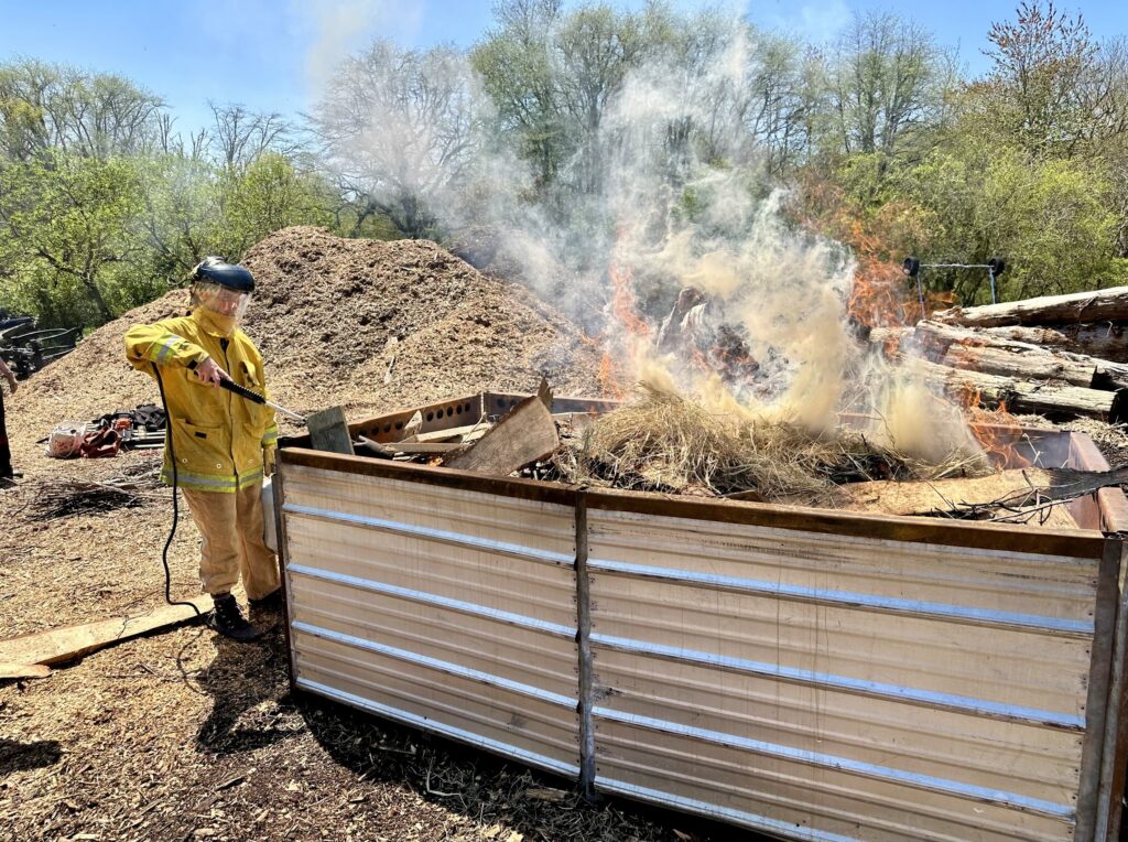 An orange blaze flickered through the air as smoke swept skyward from a six-paneled metal box — a flame cap kiln — holding a slow, steady burn of wood and brush. On this sunny Mother’s Day at Mermaid Farm, Maggie Craig, clad in a yellow fire jacket and face shield, stood close by, steadily feeding the flames. What would eventually emerge from the embers wasn’t ash, but something far more valuable: biochar.